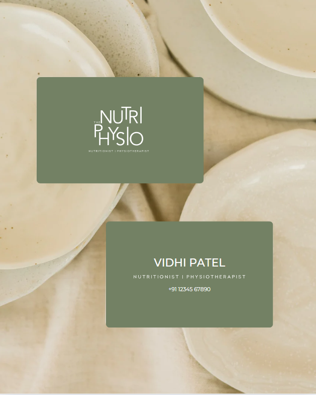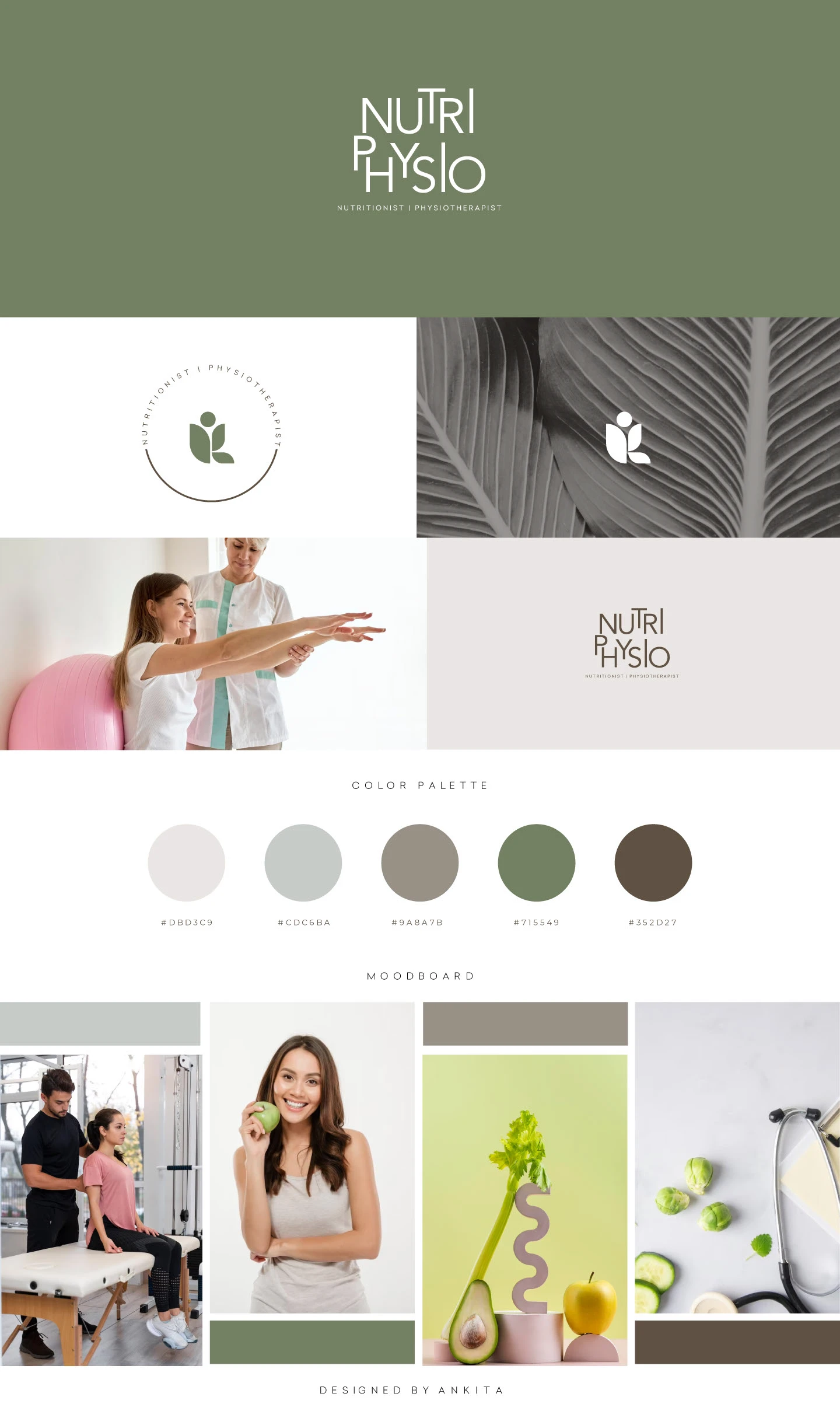 NutriPhysio is a holistic brand identity created for a dual-service practice focused on nutrition and physiotherapy. The brand needed to reflect balance, wellness, and trust, combining the clinical reliability of physiotherapy with the natural, wholesome essence of nutritional care. The visual identity is rooted in earthy, calming tones—soft sage, clay beige, and forest green—designed to evoke a sense of healing, calm, and rejuvenation. The minimalist yet organic logo mark subtly integrates a human figure and leaf motif, reinforcing the connection between body health and natural nutrition.